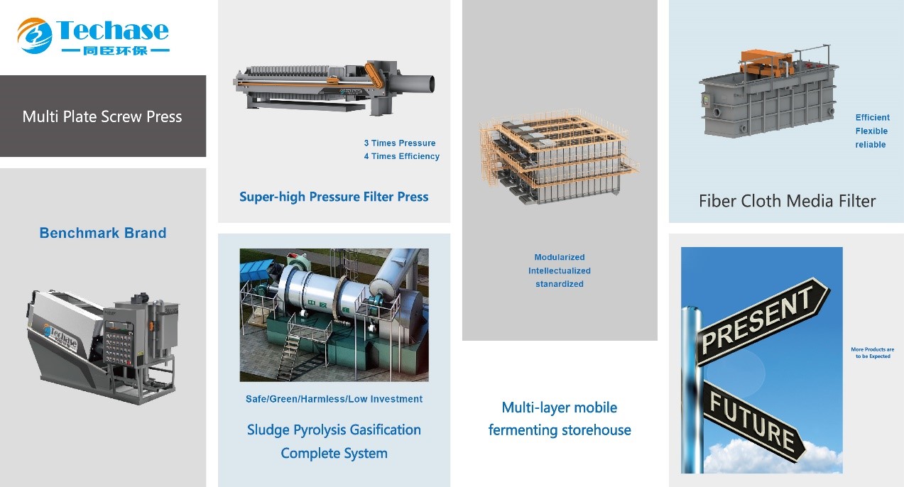 Techase is always regard “innovation, solving environmental problems and promoting green development” as the mission, and we were founded in Shanghai and originated from Tongji. As a supplier of equipment and technical services in sewage and sludge treatment field, we provide high-tech equipment such as Multi Plate Screw Press, Super-High Pressure Filter Press, Fiber Cloth Media Filter etc. and system integration service such as deep sludge dewatering, sludge pyrolysis gasification, sludge aerobic composting, black odor water treatment and water treatment etc.