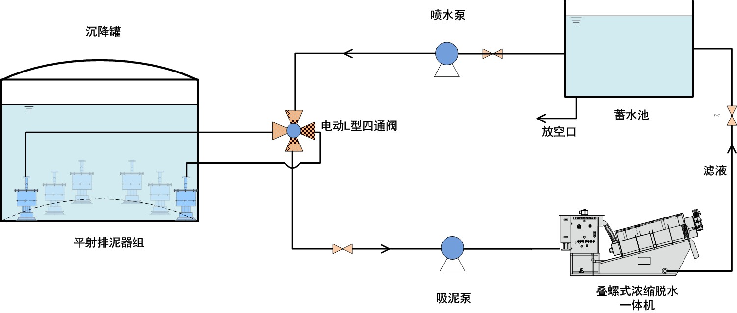平射排泥器分为吸入与喷出两种工作状态,2组平射排泥器交错分布在储罐内,同组的平射排泥系统连接在一起,并与电动双L型四通阀相连。四通阀定时换向,使交错分布的2组平射排泥器的状态不断改变,从而提高了冲洗排泥效果。